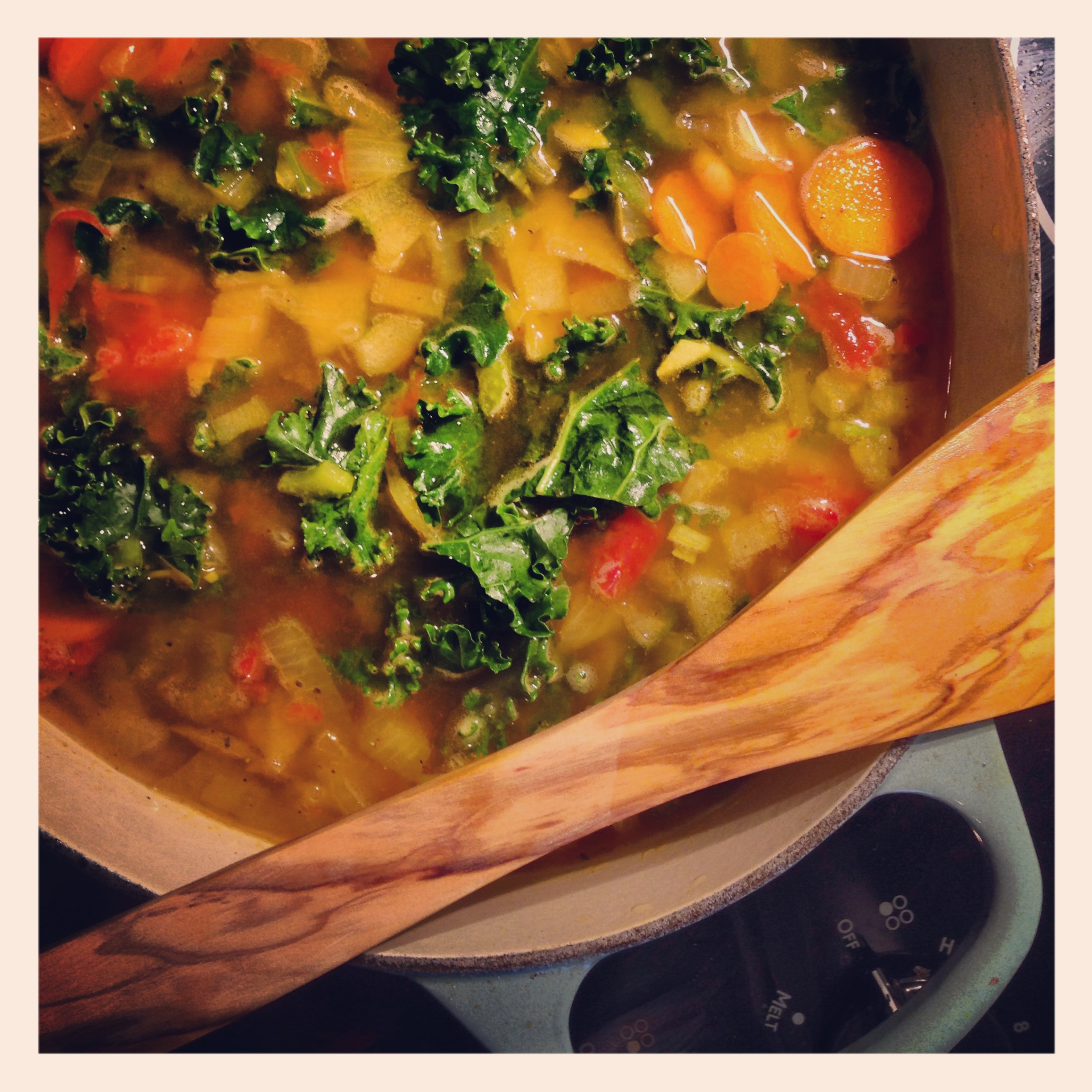 Rough chop carrots, celery, onion and garlic. Sauté onions and garlic first in extra virgin olive oil until onions are translucent (medium heat) once done put in the rest of the veggies, MINUS kale. Season with S&P, turmeric, chili powder, bay leaves. Add in the veggie broth and water. ( i used a 6Qt le creuset pot) throw in tomatoes, beans. Bring to boil