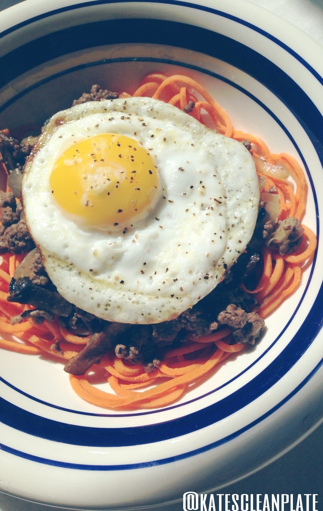 You have your protein from the egg and grass fed beef, and starch from the sweet potato noodles. Also buried under all that goodness, is some portobello mushrooms and onions.