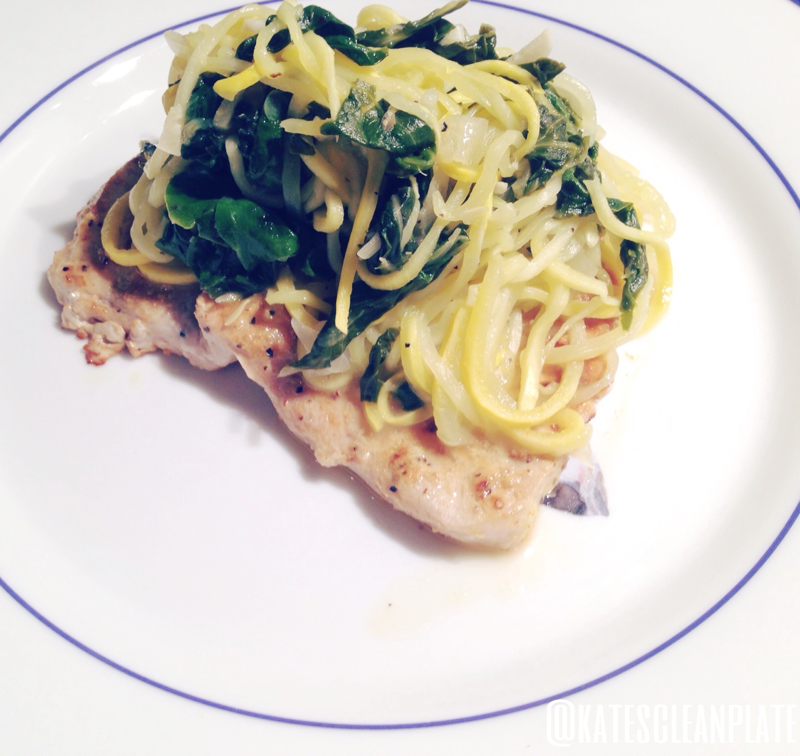 This dinner is easy and super light. Slow cooking the onions till they are caramelized really brings out a delicious flavor that makes this dish. Swiss chard is a great ingredient to swap for the usual spinach or kale, and who doesn’t love some yellow squash noodles! Here’s how it all came together..