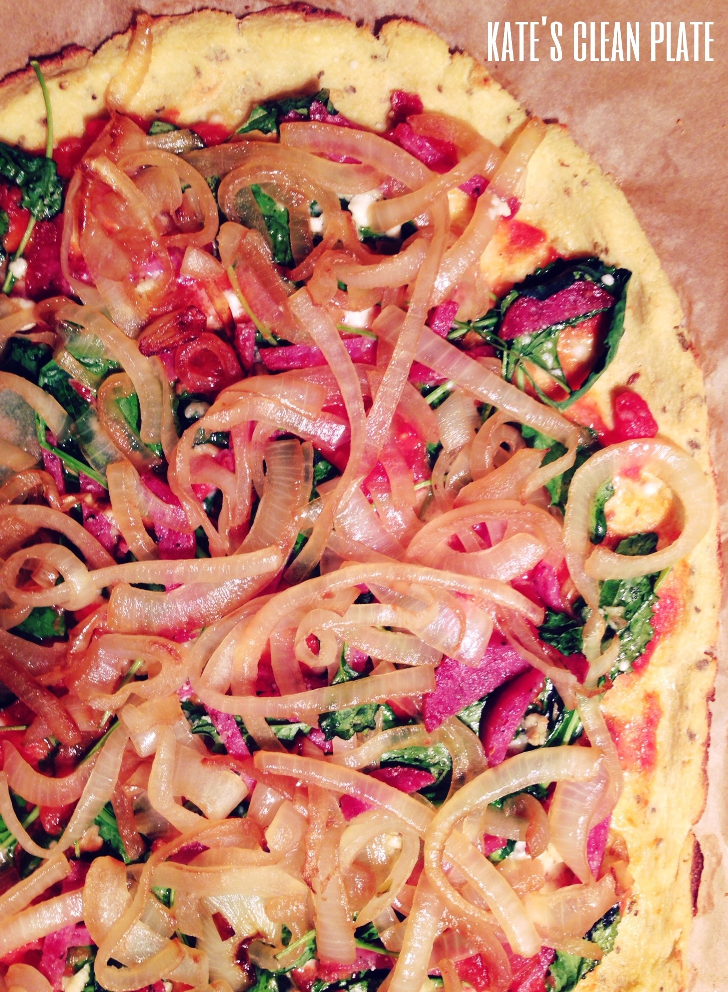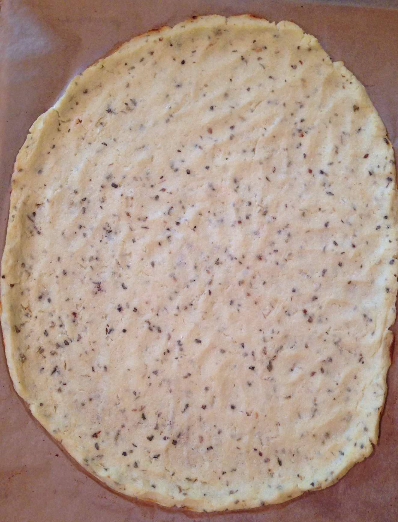 ***I used parchment paper on a cookie sheet. Next time i make this, i am going to just put a little bit of olive oil on the sheet and then lay the dough on. My crust wasn’t cooked enough for my liking, and i believe it was because of the parchment paper.