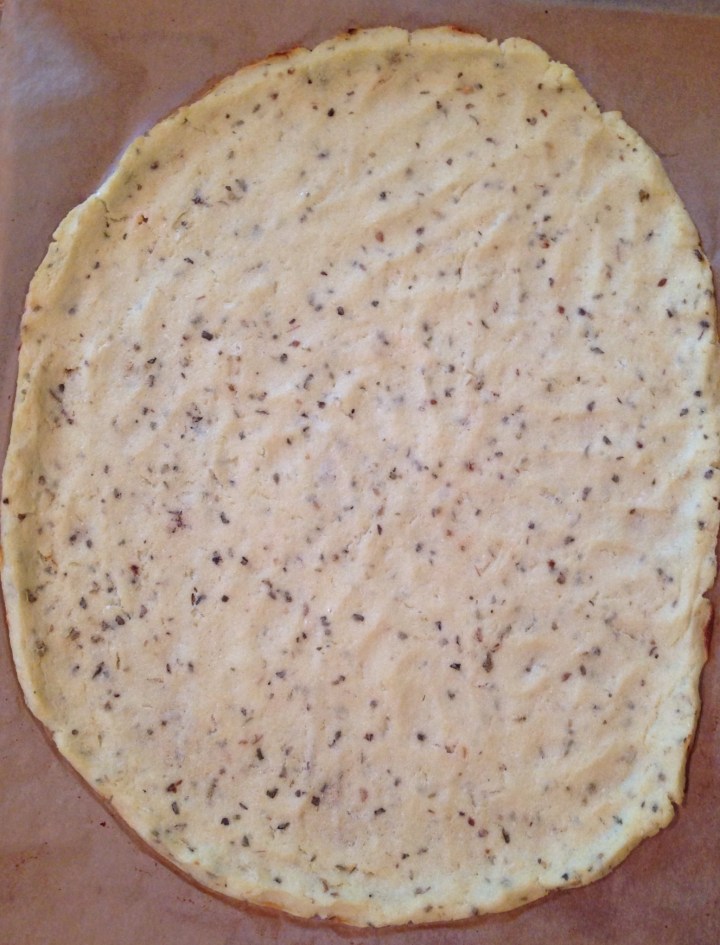 -On your coated cookie sheet, add your ball of dough, and carefully spread it out into a circle with your fingers.(Like pictured above) don’t make it paper thin.